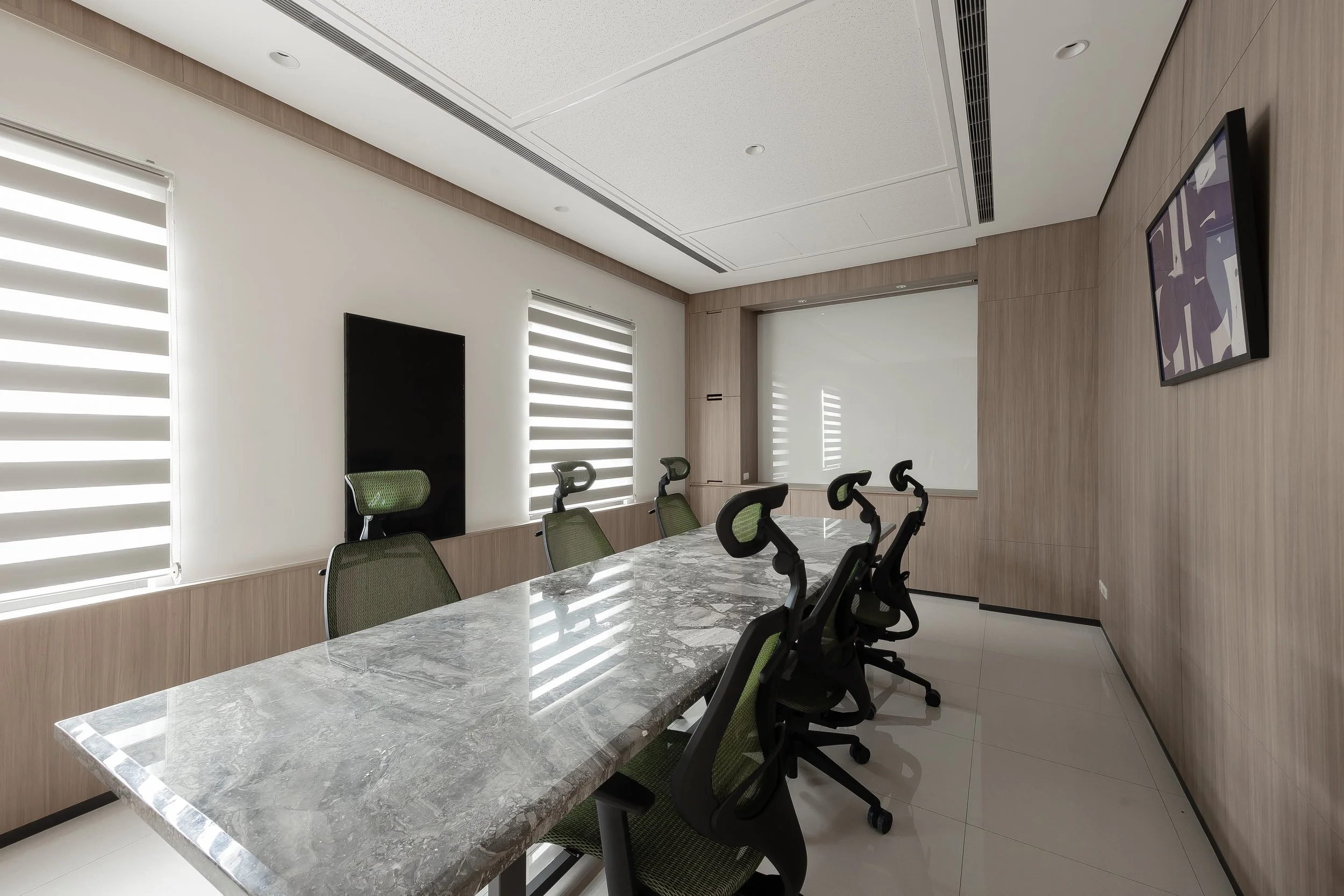 大面積石材桌搭配木質牆面,建立專業感與溫潤調性兼具的氛圍。日光灑落之際,每一次的討論都在理性與靈感之間轉化,成為創新思維的空間。